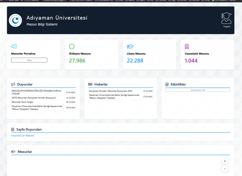 Mezuniyet sonrasında da üniversitenizle olan bağlarınızı güçlü tutun! Adıyaman Üniversitesi Mezun Bilgi Sistemi, mezunlarımız için özel olarak tasarlanmış, sizleri üniversite topluluğunun sürekli bir parçası olarak gören dijital bir köprüdür. Bu sistem üzerinden kişisel iletişim bilgilerinizi güncelleyebilir, diğer mezunlarla ağ kurabilir, üniversiteden gelen kariyer fırsatları ve duyurularını takip edebilirsiniz. Ayrıca, mezuniyet belgelerinize dijital ortamda erişim sağlayabilir ve sizler için düzenlenen özel etkinliklere kolayca katılabilirsiniz. Geleceği birlikte şekillendirmek için, mezun ağımızın değerli bir üyesi olmaya devam edin.